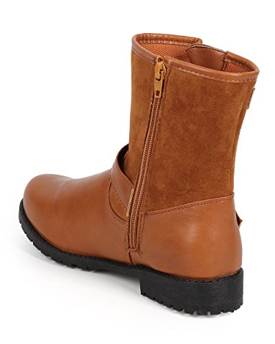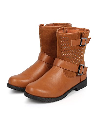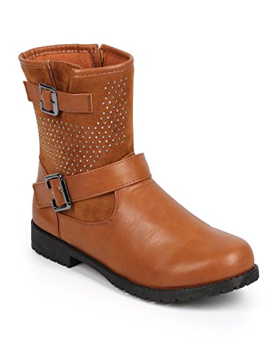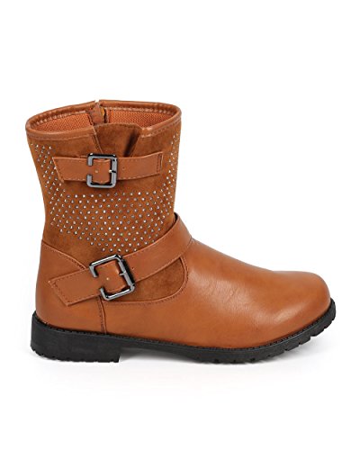 Bumper DB24 Women Leatherette Round Toe Strappy Stud Motorcycle Boot - Camel
