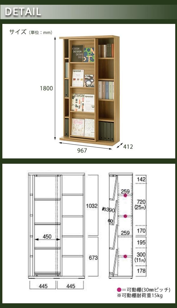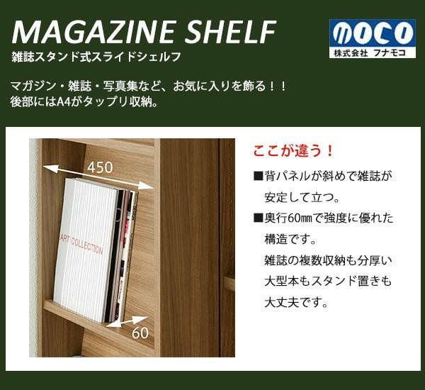 マガジン・雑誌・写真集など、お気に入りを飾る!後部にはA4サイズのものが収納できます。 製造国:日本 素材・材質:プリント化粧板 商品サイズ:W967×D412×H1800mm 仕様:完成品可動棚板:6枚可動棚板耐荷重:15kg(1枚あたり) 付属品:固定金具、棚ダボ、説明書 ※サプライヤー直送品【商品名】フナモコ 日本製 MAGAZINE SHELF 雑誌スタンド式スライドシェルフ 967×412×1800mm リアルウォールナット・SGD-97