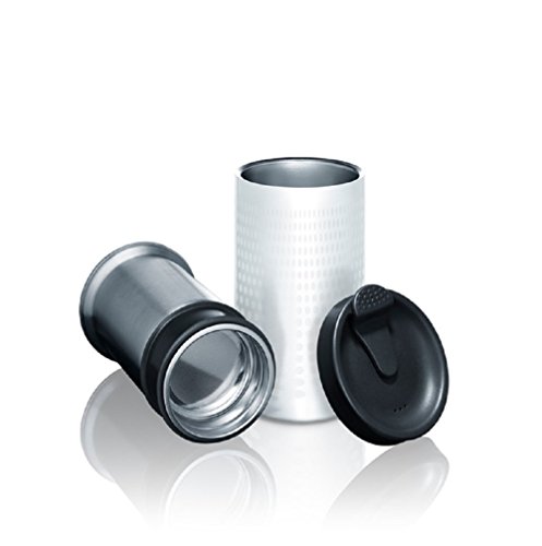 -. Feature : Stainless steel and silicone with silver accents / Double walled / Reverse flow filter is pressed down after desired brewing time, nesting in the outer cup / Brewing stops once inner cup is fully nested / Can use any sized coffee grounds