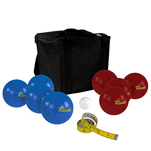 - Bocce Set Includes Four Cardinal Colored Balls and Four Blue Colored Balls, 1 Pallino White Ball, and Measuring Tape