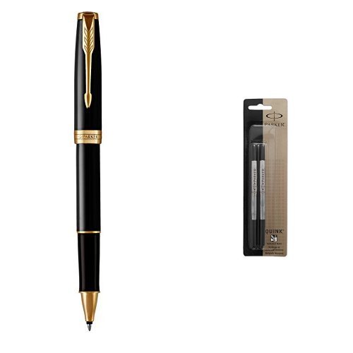 PARKER Sonnet Rollerball Pen Set, Black Lacquer with Gold Trim, Fine Point with 2 Black Ink Refills