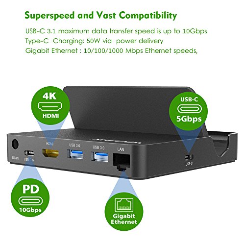 SUPERSPEED PORTS - A USB-C (to host) data transfer speed is up to 10Gbps,20V/2.5A (50W) power delivery to your laptop.A Gigabit Ethernet port provides access to superfast 10/100/1000Mbps network speeds.Two USB 3.0 Ports speed up to 5Gbps for more peripheral devices like keyboard, thumb drive.