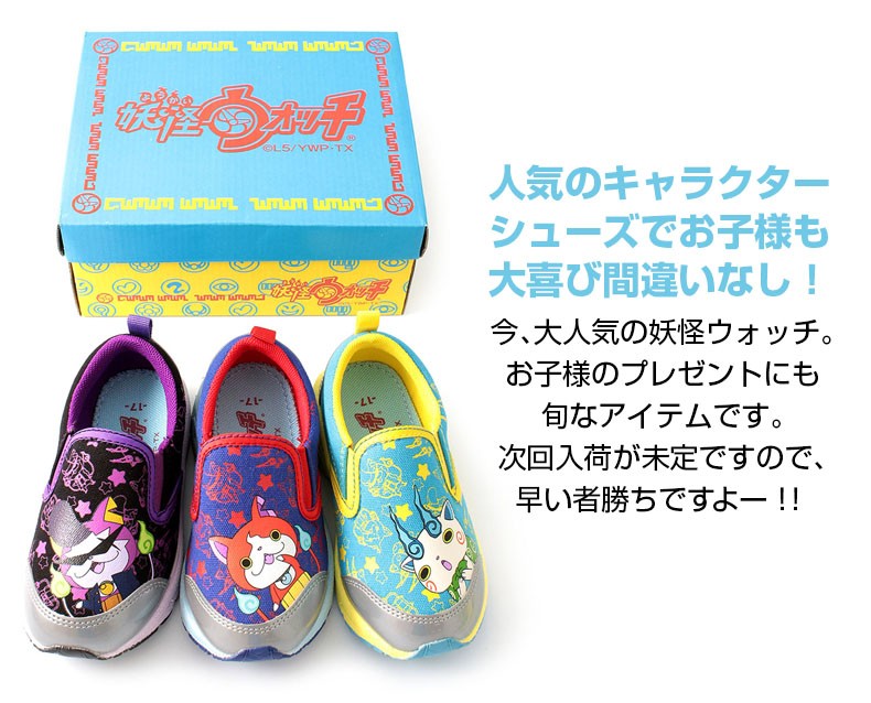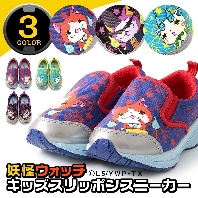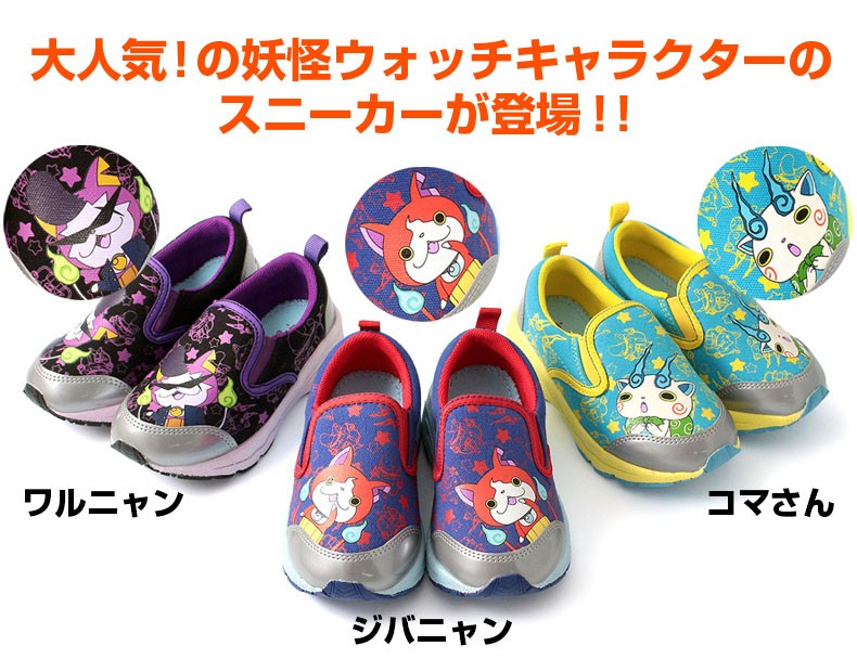 | ポイント | 【7,560円以上送料無料】 【メール便不可】 妖怪ウォッチからスポーティーなスリッポンが登場! アッパー全面にキャラクターのグラフィックをあしらったポップなデザイン☆ スリッポンタイプで脱ぎ履きも楽々♪ ギフトやプレゼントにもオススメです♪ | |||||