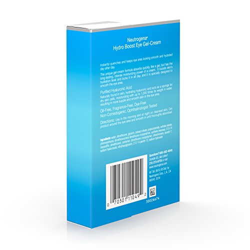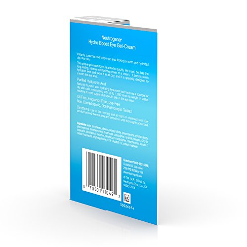 Moisturize the delicate eye area with Neutrogena Hydro Boost Eye Gel-Cream. Specially designed to help smooth the skin around the eyes, this eye cream boosts skin's hydration level and locks it in all day. The unique water gel formula absorbs quickly like a gel, with the long-lasting, intense moisturizing power of a cream. This eye gel is formulated with hyaluronic acid, which is naturally found in the skin. Hyaluronic acid acts as a sponge for dry skin cells moisturizing with up to 1,000 times its weight in water, resulting in more supple and smooth skin.This opthamologist-tested water gel-cream is oil-, dye-, and fragrance-free and non-comedogenic. It can be worn alone or under makeup.