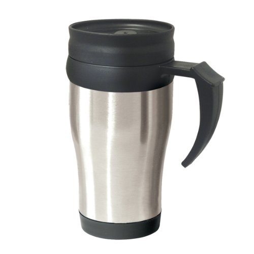 -. Feature : Store and carry coffee, water, juice or carbonated drinks with ease / Stainless steel travel mug with handle, holds up to 14 ounces / Exterior made of stainless steel; interior made of high density polypropylene / BPA free / Stainless steel tumbler keeps drinks hot or cold
