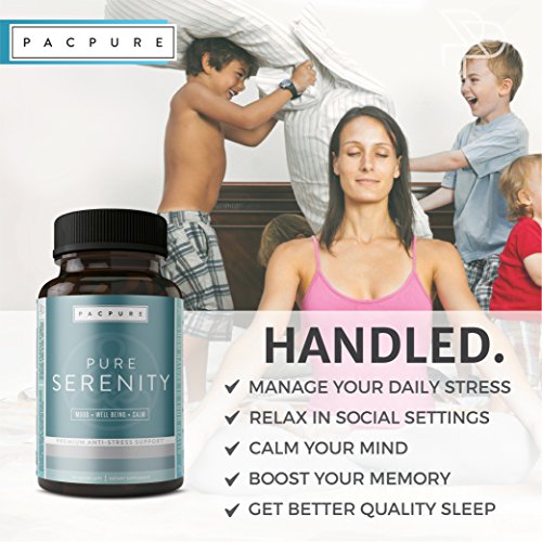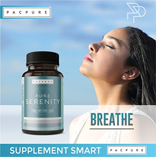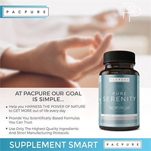 -. Feature : FEEL CALM INSTEAD OF ANXIOUS AND STRESSED: Do you often feel overwhelmed with worry and racing thoughts? Our natural anxiety supplement can help relieve your stress, relax your mind, and help you take on the day feeling more positive. Mingle more confidently in social settings, bring focus to that work presentation, be a better version of you. Try Pure Serenity today and experience it for yourself. / THE PACPURE DIFFERENCE: We feel that you deserve to have the smartest supplement formulas available, and we are dedicated to making that happen. At PacPure we work with our lab to focus on the leading supplement research so we can arrive at the most optimized formulas to help you reach your health goals. / ANXIETY RELIEF WITH THE POWER OF A STACK: Why settle for a single ingredient solution when you can get the power of multiple ingredients working together? Combining 5-htp, GABA, Ashwagandha, Rhodiola Rosea, Bacopa Monnieri, Chamomile, Magnesium & more is like trading in a two-wheel bicycle for the power of a turbocharged V-6 engine. Our calming supplement stack can naturally reduce cortisol, the body's stress hormone, and support healthy serotonin levels for an effective mood boost. / A NATURAL SOLUTION WITHOUT HARMFUL SIDE EFFECTS: With so many synthetic ingredients on the market that can produce harsh side effects, our natural stress supplement offers an alternative that uses proven ingredients your body will recognize and be able to use. Straight from nature to your health. / OUR COMMITTMENT TO YOU: It's simple, we will only bring you the best in products and service. Pure Serenity anti-anxiety relief supplement is carefully formulated right here in the U.S. where it is rigorously tested for quality. You can always purchase with confidence knowing you are backed by our 60-day, 100% money-back guarantee. You have nothing to lose in giving Pure Serenity a try.