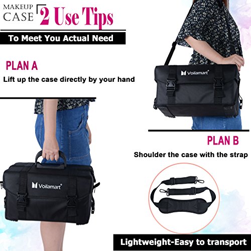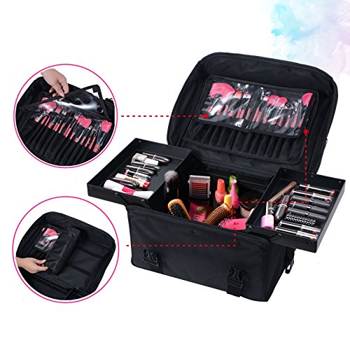 Top sections contains 2 extendable trays with large hollow storage space underneath for large item such as hair blower and spray bottles; Comes with removable 13 pcs brush holder; Use as Carry-on bag with the detachable shoulder straps