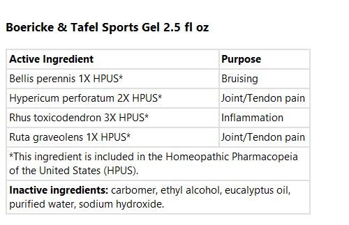 -. Binding : Health and Beauty -. Brand : Boericke & Tafel -. Label : BOERICKE AND TAFEL -. Manufacturer : BOERICKE AND TAFEL -. PackageQuantity : 1 -. ProductGroup : Health and Beauty -. ProductTypeName : HEALTH_PERSONAL_CARE -. Publisher : BOERICKE AND TAFEL -. Studio : BOERICKE AND TAFEL -. Title : Sports Gel