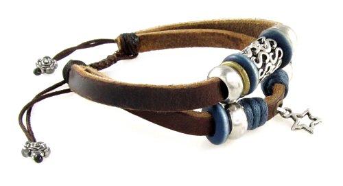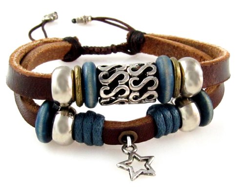 -. Feature : Two Strand Leather Bracelet With Lucky Star Drop / Silvertone Beads, Metal Beads, Blue Wood Beads / This Smaller Size Adjustable Bracelet Fits 5.5 to 7.5 Inches (Extra Small to Average/Large) / Arrives in Foil Gift Box with Attractive Bow