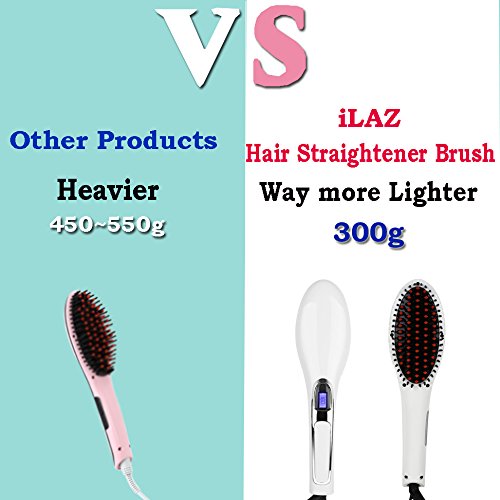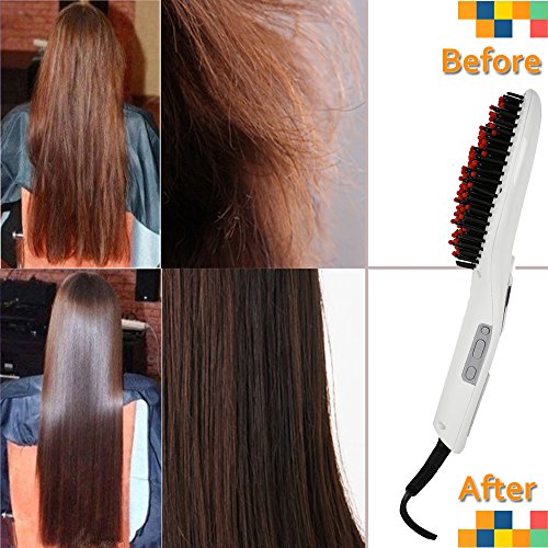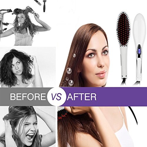 Feature : UPDATED GENERATION OF HAIR STRAIGHTENER SAVES TIME AND MONEY: Are you still using an old-fashioned splint hair straightener? Is it difficult to maneuver, and burns hair or skin easily? This updated generation of hair straightening brush makes straightening your hair as easily as combing it. It is safe, so you will not burn your hands or scalp. It is also something you can do yourself and get professional results, so you will not have to spend a lot of time and money at the salon. / ANTI-SCALD TECHNOLOGY ASSURANCE: This hair straightening device is constructed of quality DuPont plastic materials, and features a patented CE- and ROSH-certified design to prevent scalding and burning. The brush surface maintains a constant temperature to stop user from burning skin or hands. We believe that safety should be our first priority. For the customers' protection, all components are manufactured with the highest quality raw materials and inspector certified. / INSTANT HEAT ON CONTACT: This electric hair straightening brush works with 110 V and takes less than 90 seconds to get as hot as 110°C thanks to expert-grade PTC ceramic heating components. The same components also help it maintain a constant, designated temperature. The result: professional effects without burning or scalding. / LIGHTER, BUT POWERFUL: Hair styler only weights less than 300g, Special design to free your hands and allows it to quickly make contact and heat large portions of hair at one time. Heats evenly and thoroughly to produce the most professional-looking results. / SIMPLE TO OPERATE: Hair straightening brush allows you to straighten hair at home on your own. High end liquid crystal display lets you control and monitor temperatures easily, and the rotating wire means you can hold the device at any angle for the best straightening results.