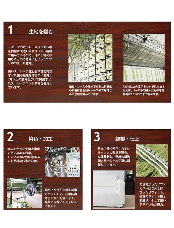 | 高い伸縮性のあるストレッチニットでソファにぴったりとフィット、着脱も簡単にできます。また、抗菌防臭加工が施してあり、洗濯機で丸洗いもできるのでお手入れも簡単です!すべて日本国内で編み上げから製品仕上げまで行なっております。 |