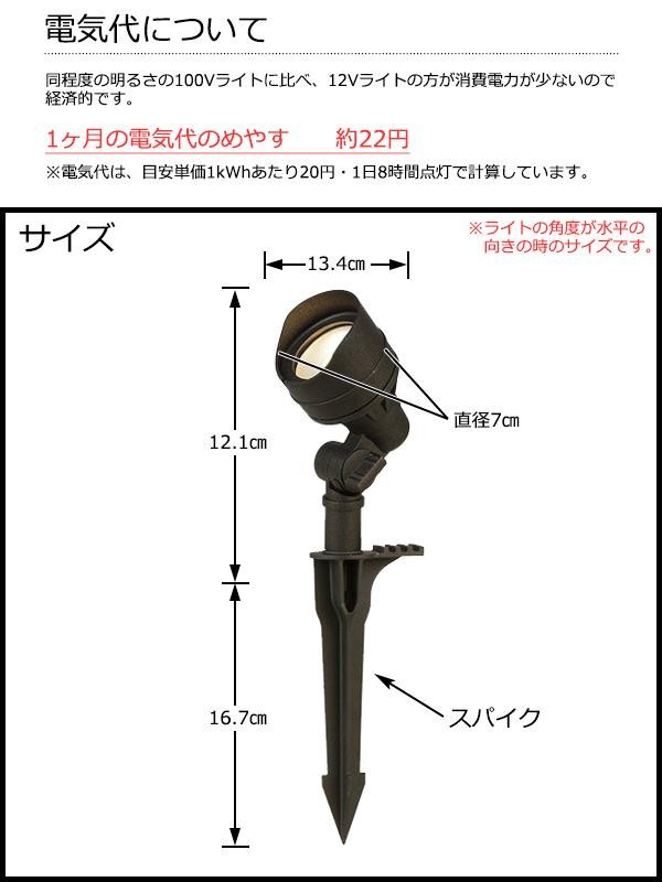 | 仕様 | 4.5WLED 色温度:3000K(電球色) 全光束:205ルーメン 電圧:12V 定格寿命:約40000時間 配光角度:70度 照射距離めやす:2m(周囲の明るさによって変わる) 黒色 防雨型 LED交換不可 専用トランス及びケーブルが別途必要 メーカー指定以外の電源トランスは使用不可 |