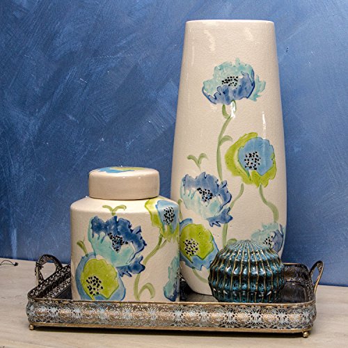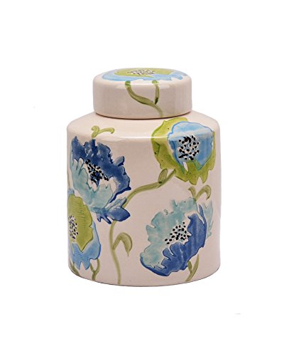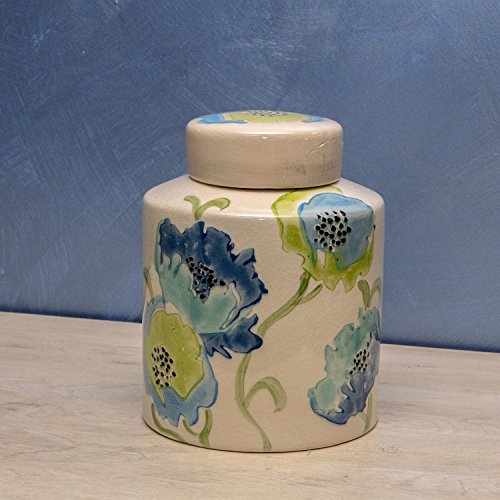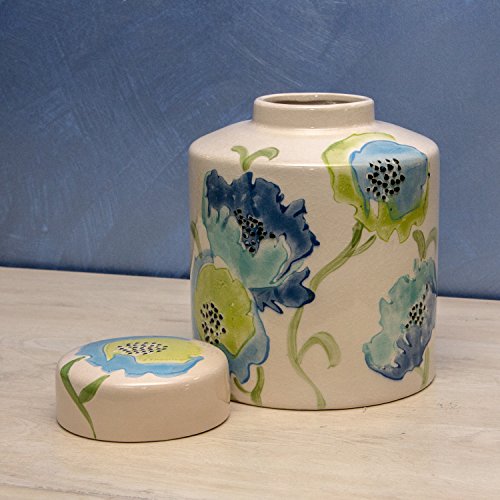 Sagebrook Home 10609 Decorative Ceramic Poppies Covered Jar, Blue/Green, 8" x 8" x 10.5"