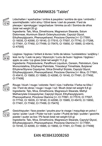 -. Feature : Schmink- / Make Up-Set in Tablet-Schutzhülle / 25 Lidschatten, 20 Lipgloss, 2 Rouge, 2 Puder / 1 kleiner Rougepinsel, 1 kleiner Lippenpinsel, 2 kleiner Doppel-Applikator / Tablet Schutzhülle in den Abmessungen (LxBxH): ca. 25,3 x 19,7 x 2,1 cm (passend für diverse Modelle)