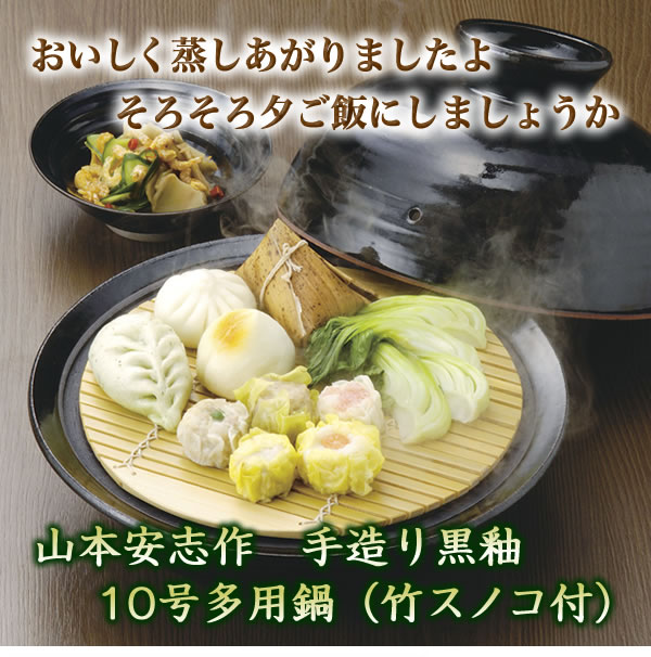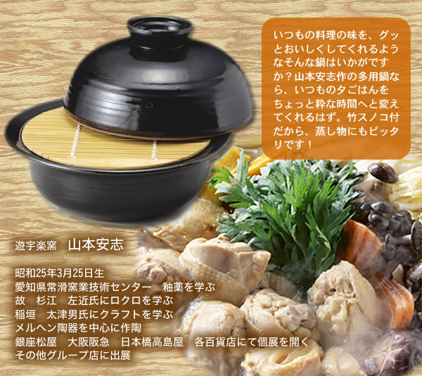 いつもの鍋を、ちょっと粋に楽しめる、こんな陶器はいかがですか?山本安志作の手造りの多用鍋です。10号サイズだから、大勢での鍋パーティーにもピッタリ♪竹スノコ付で、蒸し物にもお使いいただけます。