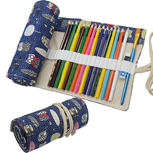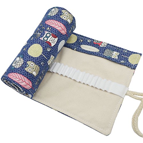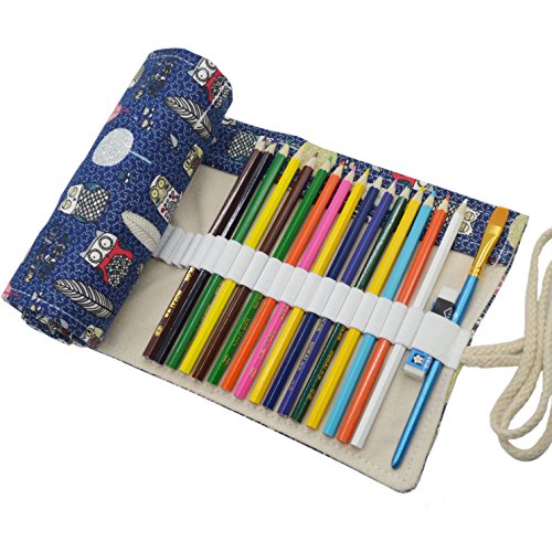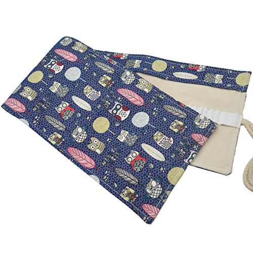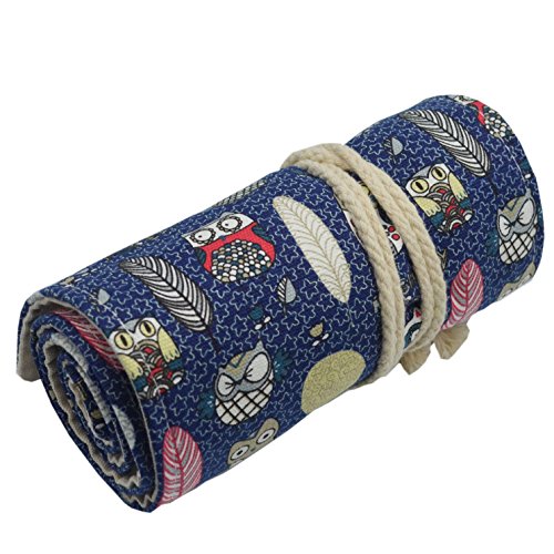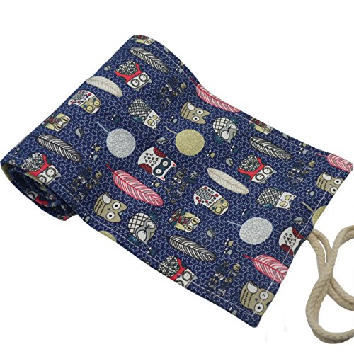 Omonic 72 Holes Pencil Roll Up Thick Canvas Wrap Pouch Holder Case Anti-Pilling Design, Artist Travel Pencil Pen Organizer Pouch Holder(Pencils not Included) (Owl)