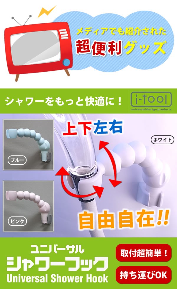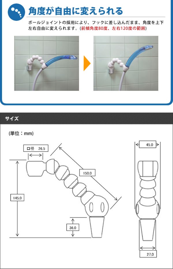 お使いのシャワーフックに差し込むだけで シャワーの向きが上下左右自在に変えられます