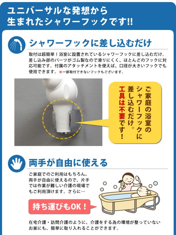 小さなお子様や 力が必要な入浴介助でも両手が使えてとっても便利です持ち運びも可能なのでマルチに使用できます