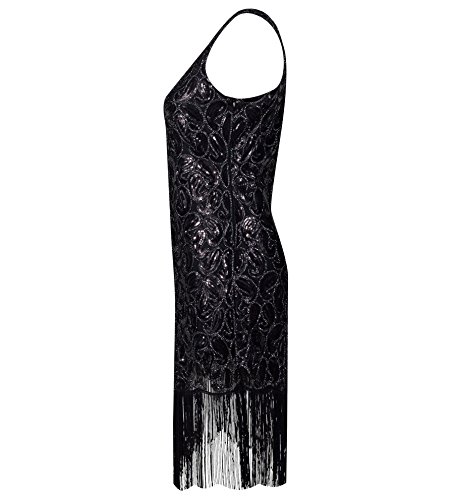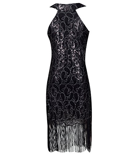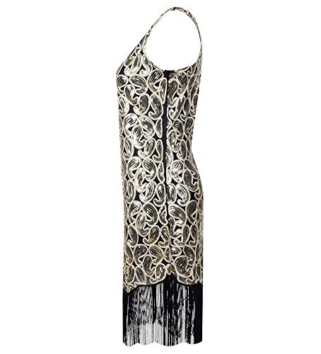 Solatin Women's Vintage 1920s Sequined Embellished Fringed Paisley Flapper Dresses(Black Gold L)