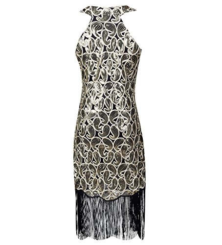 Solatin Women's Vintage 1920s Sequined Embellished Fringed Paisley Flapper Dresses(Black Gold S)