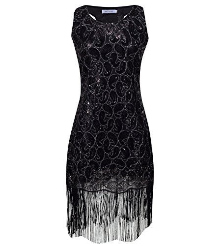 Solatin Women's Vintage 1920s Sequined Embellished Fringed Paisley Flapper Dresses(Black S)