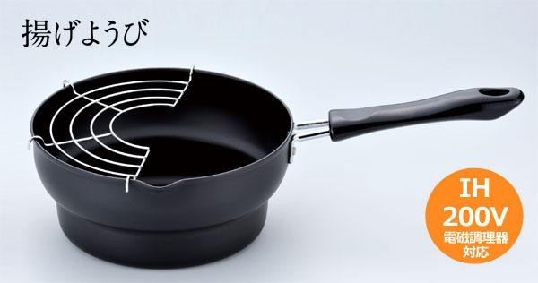 ご家庭でサクサク&アツアツの揚げたて天ぷらをもっと手軽に♪IH対応の片手天ぷら鍋です。 製造国:日本 素材・材質:本体:鉄(シリコン塗装)網:鉄(クロムメッキ) 商品サイズ:約189×350×105mm 重量:約430g 仕様:IH対応(200V)容量:約1.7L ※サプライヤー直送品 ご注文後7~8営業日後の出荷となります【商品名】揚げようび IH対応段付片手天ぷら鍋18cm AM-9189
