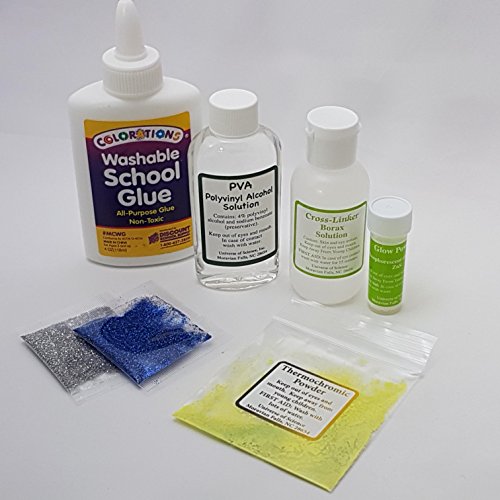 Play With Polymers and Create Strange States of Matter! -Everything you need to make Glow in the Dark Slime, Color Changing Slime, Clear Slime and Glitter Slime -Over 10 Recipes and Experiments Providing Hours of Fun for Kids Ages 8 and Up (Adult Supervision Recommended) -Easy to Follow Instructions Booklet that includes step by step directions of how to make different textured slime, as well as the chemistry behind slime making -Kids love this kit- perfect for birthdays, play dates and just to get them off the screen -Includes: 2oz PVA solution, 2oz borax solution, Thermochromic powder (color changing), 4 oz glue bottle, glitter, glow powder, a straw, 3 wooden sticks, 1 small scoop, 2 measuring cups, 3 mixing cups, 3 storage containers and a small zip bag Chemistry is fun, but always experiment carefully! All the materials in this kit are safe and non-toxic. However, anything can be dangerous when used in the wrong way and against the direction provided. Adults Supervision is recommended.Feature