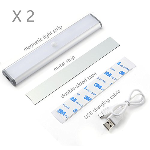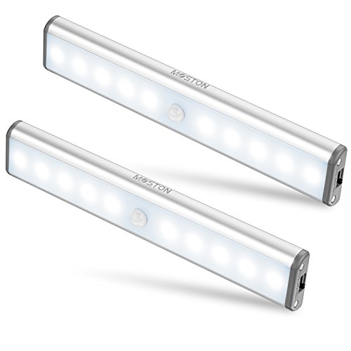 Moston Under Cabinet lights,10 LED Magnetic Motion Sensor Wardrobe Closet Lighting,Auto On/Off,Built-in Rechargeable Battery Powered Sensing Night Light,Stick-on Anywhere (Silver Aluminium,2 Pack)