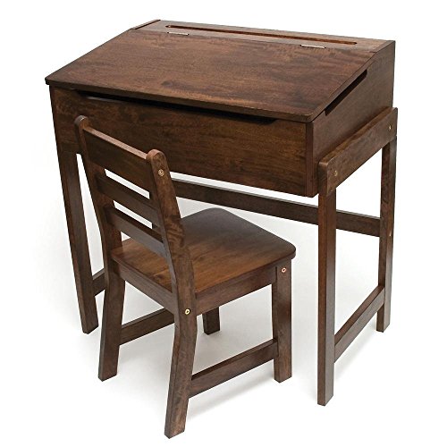 Lipper International child's slanted top desk and chair set. Like the old fashioned school desks. Lots of storage, indentations for pens and pencils. Made with recessed finger hold to protect precious fingers. Hardwood with Walnut child-safe finish. Goes with any decor. Model#: 564WN is walnut item however finish in wood products may vary due to climate conditions in the factory.Feature