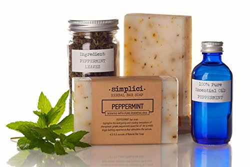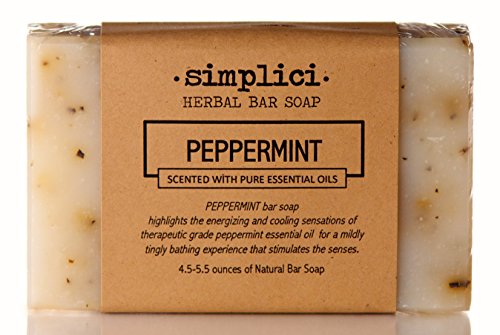 SIMPLICI PEPPERMINT BAR SOAP is a conscientiously produced and packaged skin cleanser. Artisan crafted by combining coconut oil, peppermint pure essential oil and crushed peppermint leaves with an Appalachian inspired, centuries old, lard and lye soap recipe. The result is a smooth textured, very hard, long-lasting soap bar that works into a fragrant, thick, foamy lather.