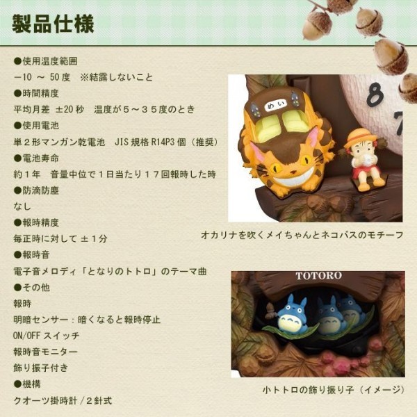 「となりのトトロ」がもつ作品のイメージである「自然」「温かみのある世界観」を反映しつつ凝縮感のある外観を創り込むことで、楽しさや賑やかさをもつ「となりのトトロ」の世界を感じられる商品に仕上げました!小トトロの飾り振り子と、オカリナを吹くメイちゃんのモチーフもポイントのクオーツ掛時計です。 |