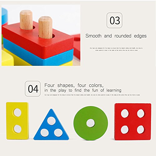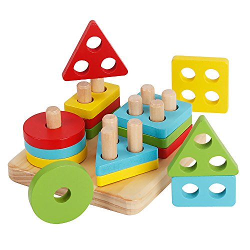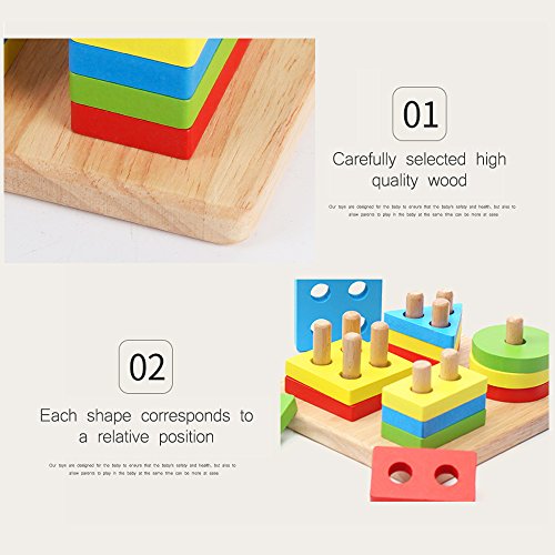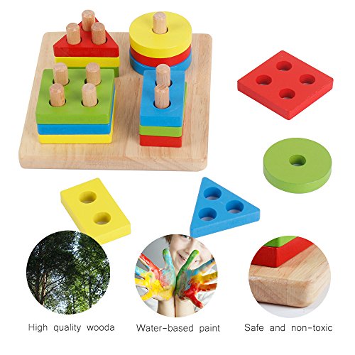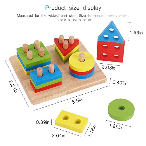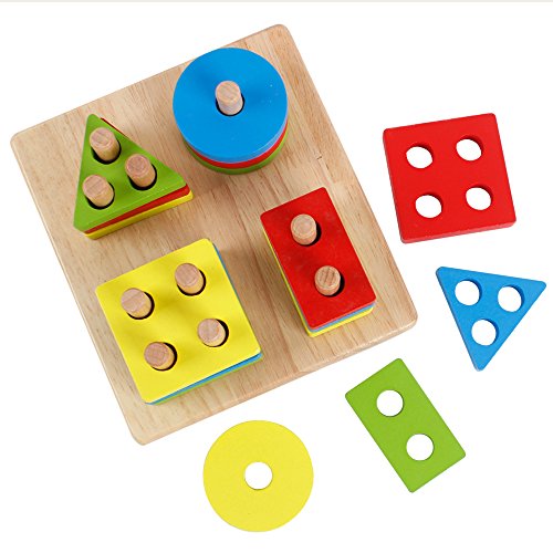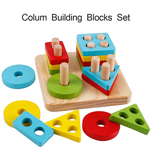 The educational toys set contains 35 pieces,detachable and removable blocks, 1 wood base and 1 instruction booklet can increase the baby's ability of creativity. Size is 8.82 x 5.83 x 2.56 inches. Great brain stimulating toy can teach colours, geometry shapes, fraction, matching, logic, fine motor skills. Wood material and smooth edge design makes the toy safe and durable. 0 |