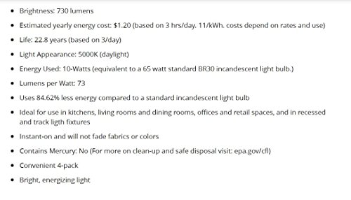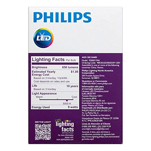 The Philips 65 watt equivalent br30 dimmable LED light bulb delivers exceptionally long life, significant energy SAVINGS, beautiful light and contains no mercury. This energy saving 9 watt LED bulb can replace a standard 65 watt halogen. The flood light provides a soft white light, perfect for general room lighting. Use in kitchens, living rooms and dining rooms, recessed cans and some track light fixtures. The dimmable light lets you create a VARIABLE ambiance in your favorite rooms.