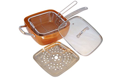 -. Title : Copper Pan, 4 Piece. Square Pan With Round Handle, Glass Lid, Steamer, Frying Basket, Steamer Stands, Induction Base Non Stick, Dish Washer Safe