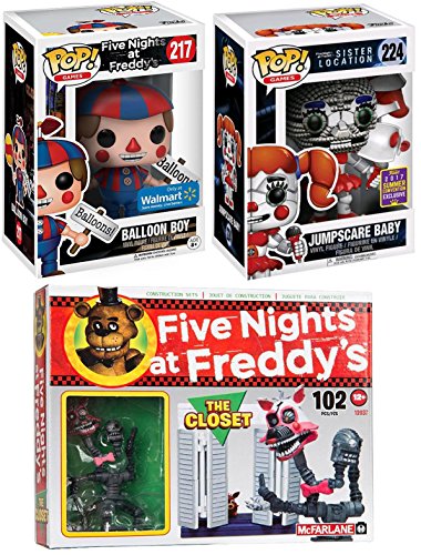 -. Feature : Five Nights At Freddy's Buildable kit by McFarlane Toys & Exclusive Vinyl Pop Figures / Buildable "The Closet" small set inspired by Scott Cawthon's Five Night's at Freddy's video game series / Figures feature articulation in the main joints and have interchangeable heads/limbs - Bricks and figures are compatible with other construction brands / POP Games: Five Nights at Freddy's Sister Location - Jumpscare Baby #224 Summer Convention Exclusive SDCC / Funko POP! Games: Five Nights at Freddy's - #217 Balloon Boy Walmart Exclusive