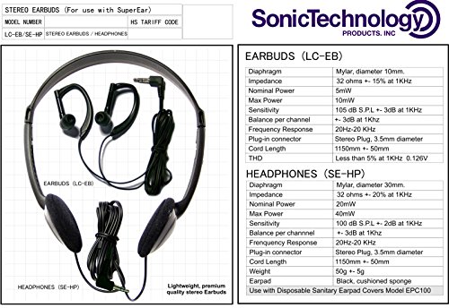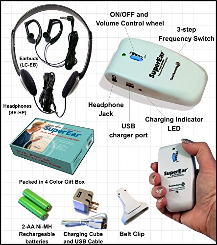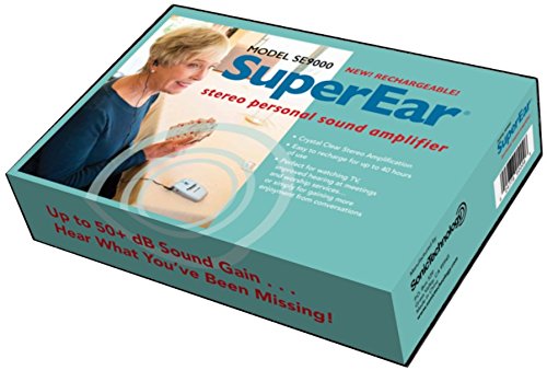 -. Brand : SuperEar -. Color : black -. Feature : 3- Position Frequency Switch Enables User to Enhance Desired Frequency Range / Premium Stereo Headphones and Unobtrusive, Discreet and Comfortable Dual Hook Style Earbuds Feature Matched Output Drivers to Deliver Clear, Crisp sound. / Volume Control Wheel Permits Easy Volume Adjustment with Lighted ON/OFF Button / Belt Clip and Owners Manual. / Rechargeable AA Batteries Provide Up to 40 Hours of Operation Each Charge -. IsAdultProduct : 0 -. Label : Sonic Technology Products -. Manufacturer : Sonic Technology Products -. MPN : SE9000HP -. PackageQuantity : 1 -. PartNumber : SE9000HP -. ProductGroup : Health and Beauty -. ProductTypeName : PERSONAL_CARE_APPLIANCE -. Publisher : Sonic Technology Products -. Studio : Sonic Technology Products -. Title : SuperEar RECHARGEABLE Sound Amplifier with Both Stereo Headphones and Earbuds, 3-Tone Fequency Selector Assistive Listening Device Increases Sound 50dB, CMS/ADA Compliant