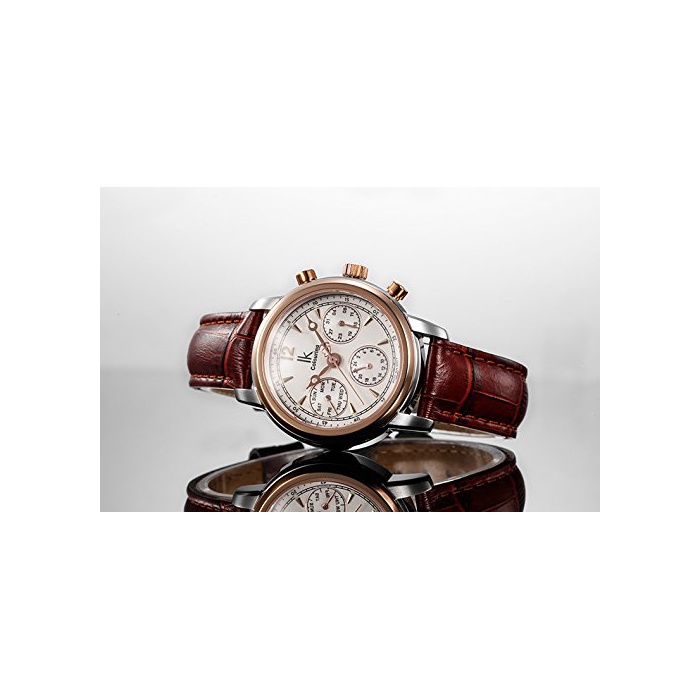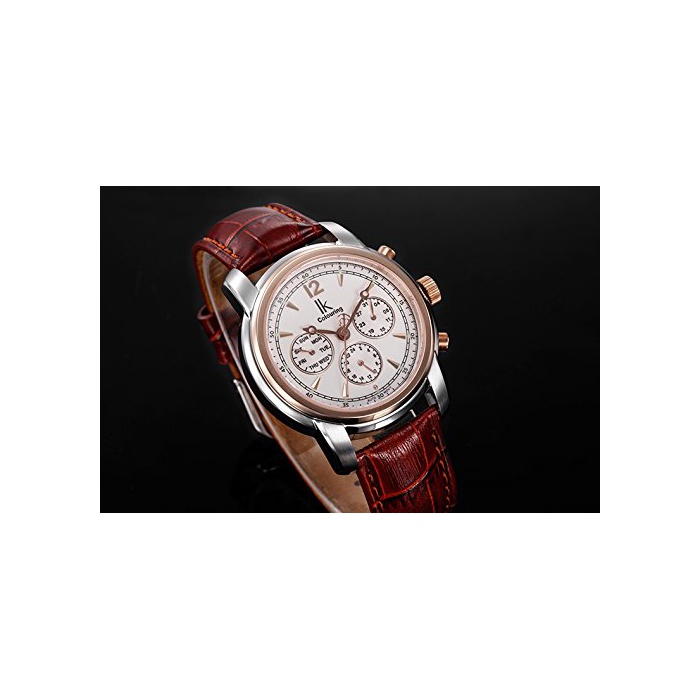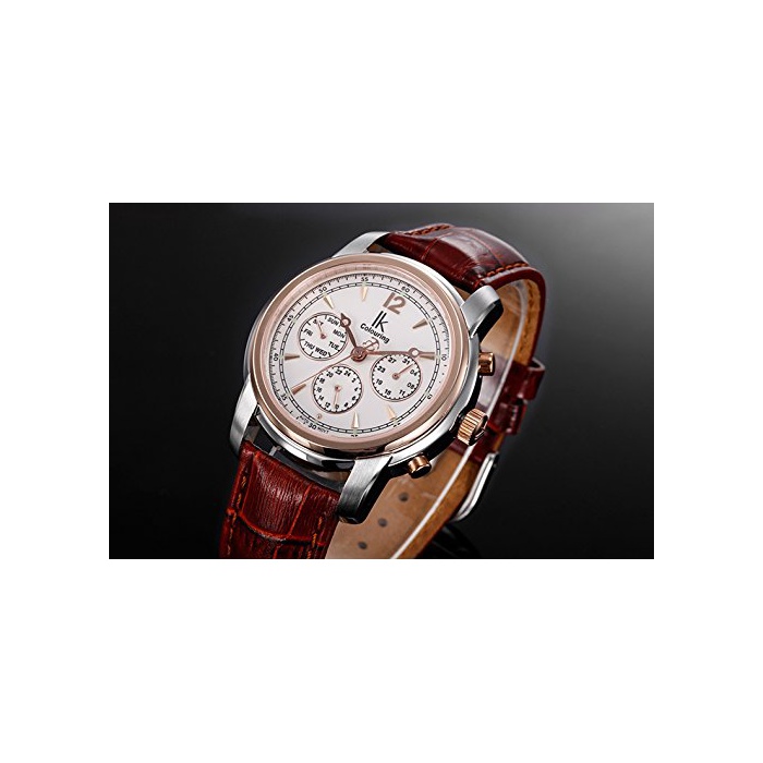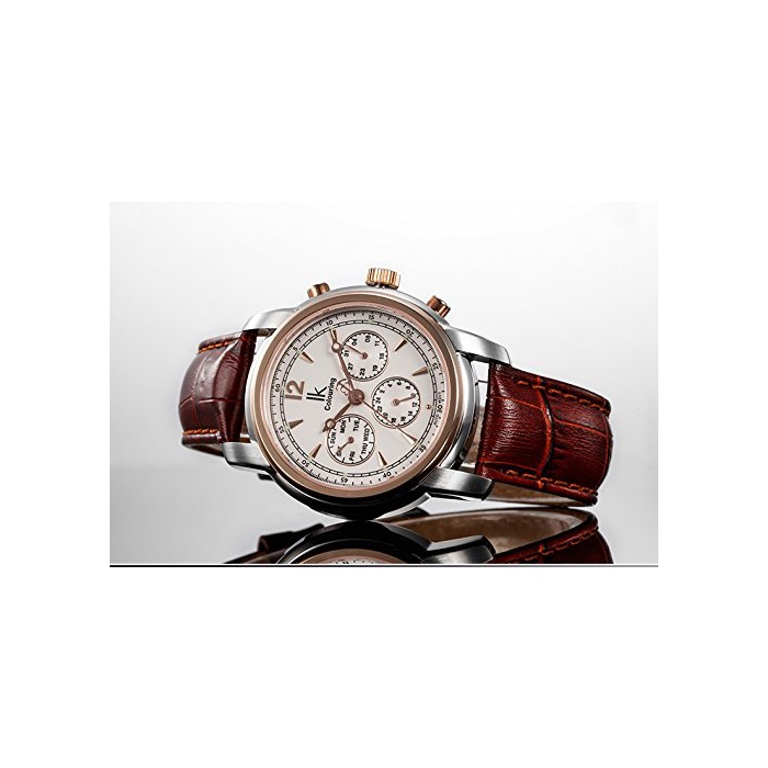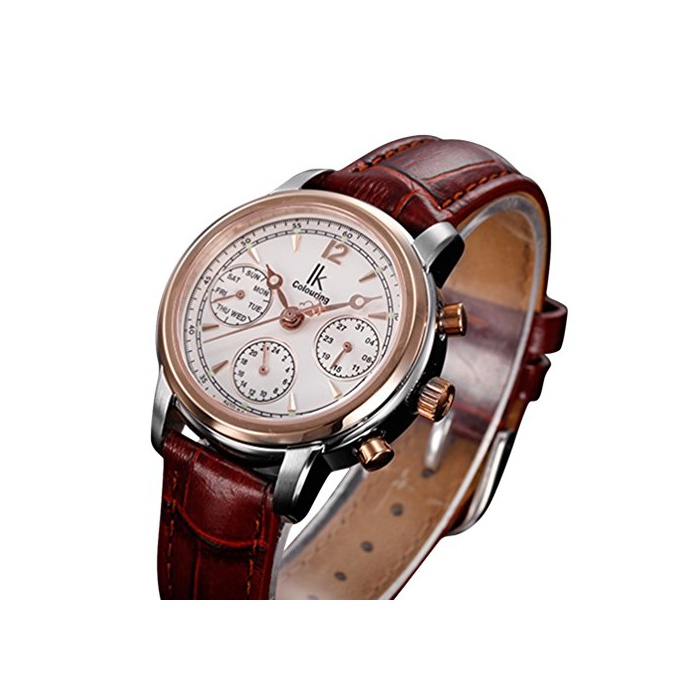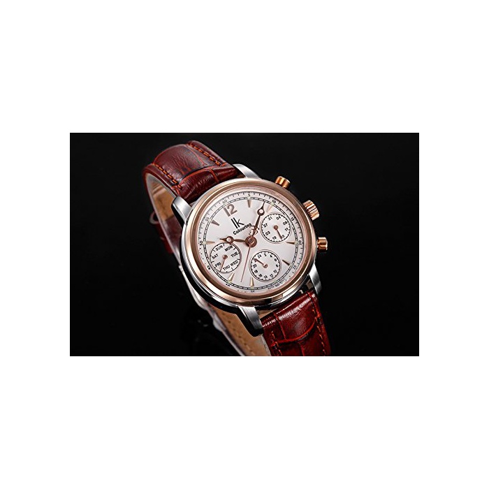 GuTe Mechanical GuTe출품 로즈 골드에 화이트 트리플 캘린더 브라운 가죽 밴드 캐주얼 엘레강트(elegant) 기계식 자동 감기 레이디스 손목시계