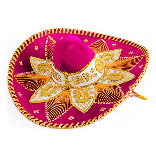 Studio : Amols Specialty Inc. Publisher : Amols Specialty Inc. Product Description Our deluxe velvet Hot Pink and Gold Mariachi Sombrero is a fun way to add some spice to your Fiesta party or Cinco de Mayo celebration. Also known in Spanish as a Charro sombrero, this hat is adult sized and can be used as a costume accessory or party table centerpiece. It is also a great decoration to hang on a door or a wall. Adult size Velvet material Chin strap included Size: 23" diameter x 8" tall Embroidery design may vary Color may include some white details 0