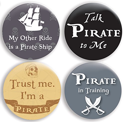 Binding : Apparel Product Description Four LARGE 2.25" (58mm) pirate-themed buttons/pins/badges. You will receive FOUR buttons to help spread the coolness of pirates. Perfect gift for: parties, workplaces, hospitals, school bags, office functions, winter coats, sweaters, workplace flair, public demonstrations and everything in between. Especially great if you'd like it to be known that you're a proud supporter of pirates! 0