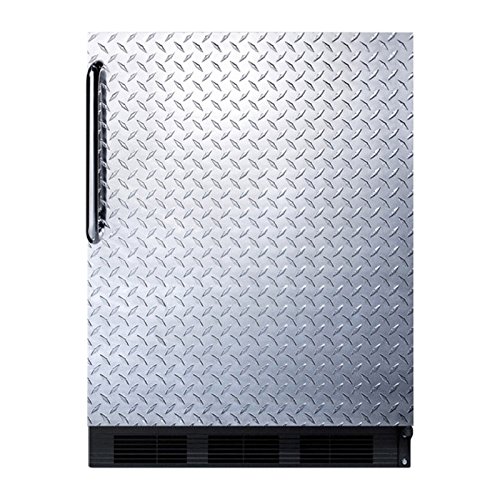 Sized with a 24" footprint, the FF63BDPL all-refrigerator is designed for freestanding use. It has a black cabinet with unique diamond plate textured door in aluminum. A curved towel bar in brushed stainless steel handle completes the industrial look.