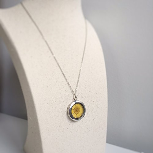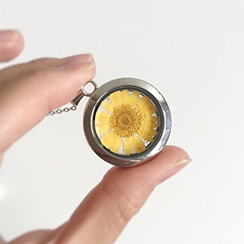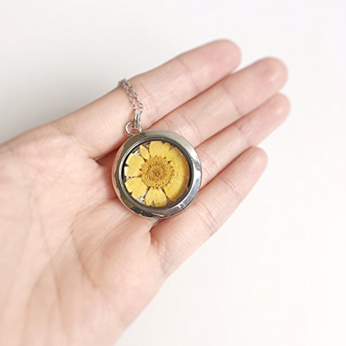 -. Title : Floating Locket Charm Sunflower Necklace - Glass - Mori Girl - Real - Kid - Natural - Statice - Woodland - Dried Limonium - Garden - Yellow
