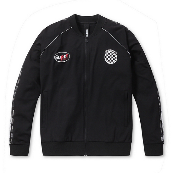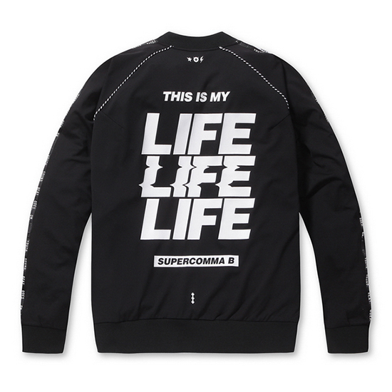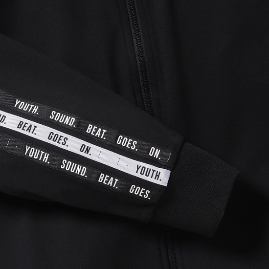 - 소매 부분 레터링 테잎 장식으로 포인트를 연출함.