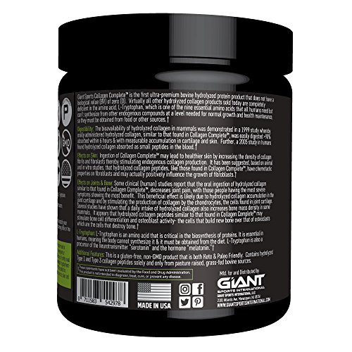 -. Feature : FULL AMINO ACID SPECTRUM: Collagen Complete is the first ultra-premium, bovine-sourced hydrolyzed collagen protein powder that does not have a biological value of zero. Virtually all other hydrolyzed collagen products sold today are deficient in the amino acid, L-Tryptophan, which is one of the nine essential amino acids / BONE AND JOINT HEALTH: Some clinical studies report ingestion of hydrolyzed collagen may decrease joint pain, with those people having the most severe symp showing the most benefit. This effect is likely due to hydrolyzed collagen accumulation in the joint cartilage and by stimulating the production of collagen by cells in joint cartilage / DIGESTIBILITY: Hydrolyzed collagen peptides have been shown to be easily digested and absorbed in the body in a variety of clinical studies. Roughly 90% of orally ingested collagen powders can be digested and absorbed within 6 hours with measurable accumulation / HEALTHIER SKIN: Ingestion of Collagen CompleteTM may lead to healthier skin by stimulating the body's collagen production ability and the growth of collagen fibroblasts / KEY FEATURES: Complete Collagen is a gluten-free, non-GMO collagen protein powder that is both Keto & Paleo Friendly. Contains hydrolyzed Type 1 and Type 3 collagen peptides solely and only from pasture raised, grass-fed bovine sources