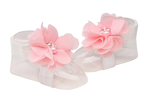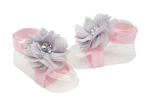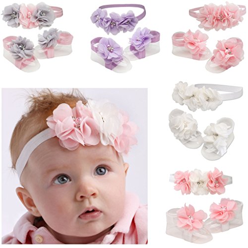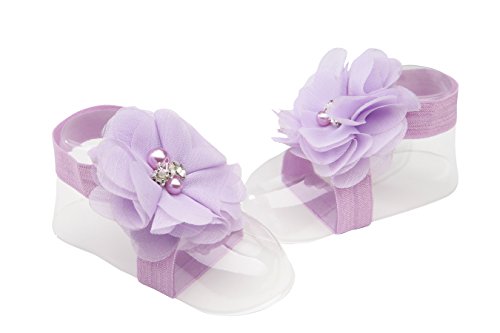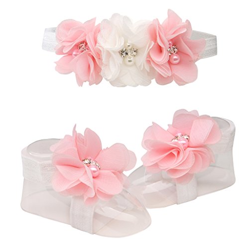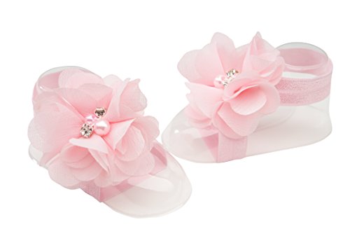 -. Feature : Adorable Baby Gift - Comes in a Cute Chiffon Gift Bag / Comes with Sweet Coordinating Headband Accented with Flowers / Soft & Comfortable Barefoot Sandal for Baby Girl (one size fits all) / Accented with Beautiful Simulated Pearls and Rhinestones / Special Keepsake She Will Treasure Forever!