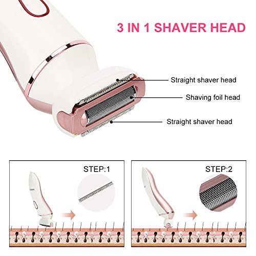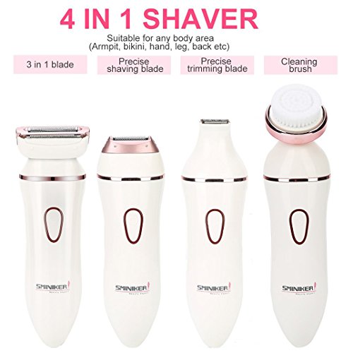 - 【MULTIFUNCTIONS】4 in 1 ladies electric shaver includes 3 in 1 Shaver Head, Precise Shaving Head, Precise Trimming head, Facial Cleansing Brush, will meet all your different needs,especially the 3 in 1 blade, which glide smoothly along contours of the skin to comfortably shave legs, underarms,arm and other body areas, gives you a smooth and painless trimming experience.