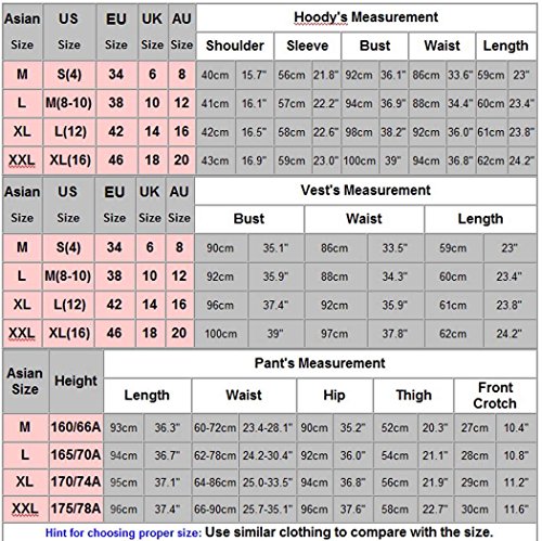 Studio : Chian Publisher : Chian Binding : Apparel Product Description 100% Brand New. Material: cotton blend Package Content:1 x Women's Hoody Pant Vest 3pcs set Asian M(US S(4) EU 34 UK 6 AU 8)--Shoulder 40cm/15.7"----Sleeve 56cm/21.8"---Bust 92cm/36.1"-Waist 86cm/33.6"-Length 59cm/23" Asian L(US M(8-10) EU 38 UK 10 AU 12)--Shoulder 41cm/16.1"-Sleeve 57cm/22.2"-Bust 94cm/36.9"-Waist 88cm/34.4"-Length 60cm/23.4" Asian XL(US L(12) EU 42 UK 14 AU 16)-Shoulder 42cm/16.5"--Sleeve 58cm/22.6"--Bust 98cm/38.2"-Waist 92cm/36.0"-Length 61cm/23.8" Asian XXL(US XL(16) EU 46 UK 18 AU 20)-Shoulder 43cm/16.9"-Sleeve 59cm/23.0"-Bust 100cm/39"-Waist 94cm/36.8"-Length 62cm/24.2"(Hoody's Measurement) Asian M(US S(4) UK 34 EU 6 AU 8)--Bust 90cm/35.1"----Waist 86cm/33.5"-Length 59cm/23" Asian L(US M(8-10) UK 38 EU 10 AU 12)-Bust 92cm/35.9"-Waist 88cm/34.3"--Length 60cm/23.4" Asian XL(US L(12) UK 42 EU 14 AU 16)--Bust 96cm/37.4"-Waist 92cm/35.9"--Length 61cm/23.8" Asian XXL(US XL(16) UK 46 EU 18 AU 20)-Bust 100cm/39"-Waist 97cm/37.8"--Length 62cm/24.2"(Vest's Measurement) Asian M -Height 160/66A-Length 93cm/36.3"-Waist 60-72cm/23.4-28.1"-Hip 90cm/35.2"-Thigh 52cm/20.3"-Front Crotch 27cm/10.4" Asian L -Height 165/70A-Length 94cm/36.7"-Waist 62-78cm/24.2-30.4"-Hip 92cm/36.0"-Thigh 54cm/21.1"-Front Crotch 28cm/10.8" Asian XL -Height 170/74A-Length 95cm/37.1"Waist 64-86cm/25.0-33.5"-Hip 94cm/36.8"-Thigh 56cm/21.9"-Front Crotch 29cm/11.2" Asian XXL-Height 175/78A-Length 96cm/37.4"-Waist 66-90cm/25.7-35.1"--Hip 96cm/37.6"-Thigh 58cm/22.7"-Front Crotch 30cm/11.6"(Pant's Measurement) 0