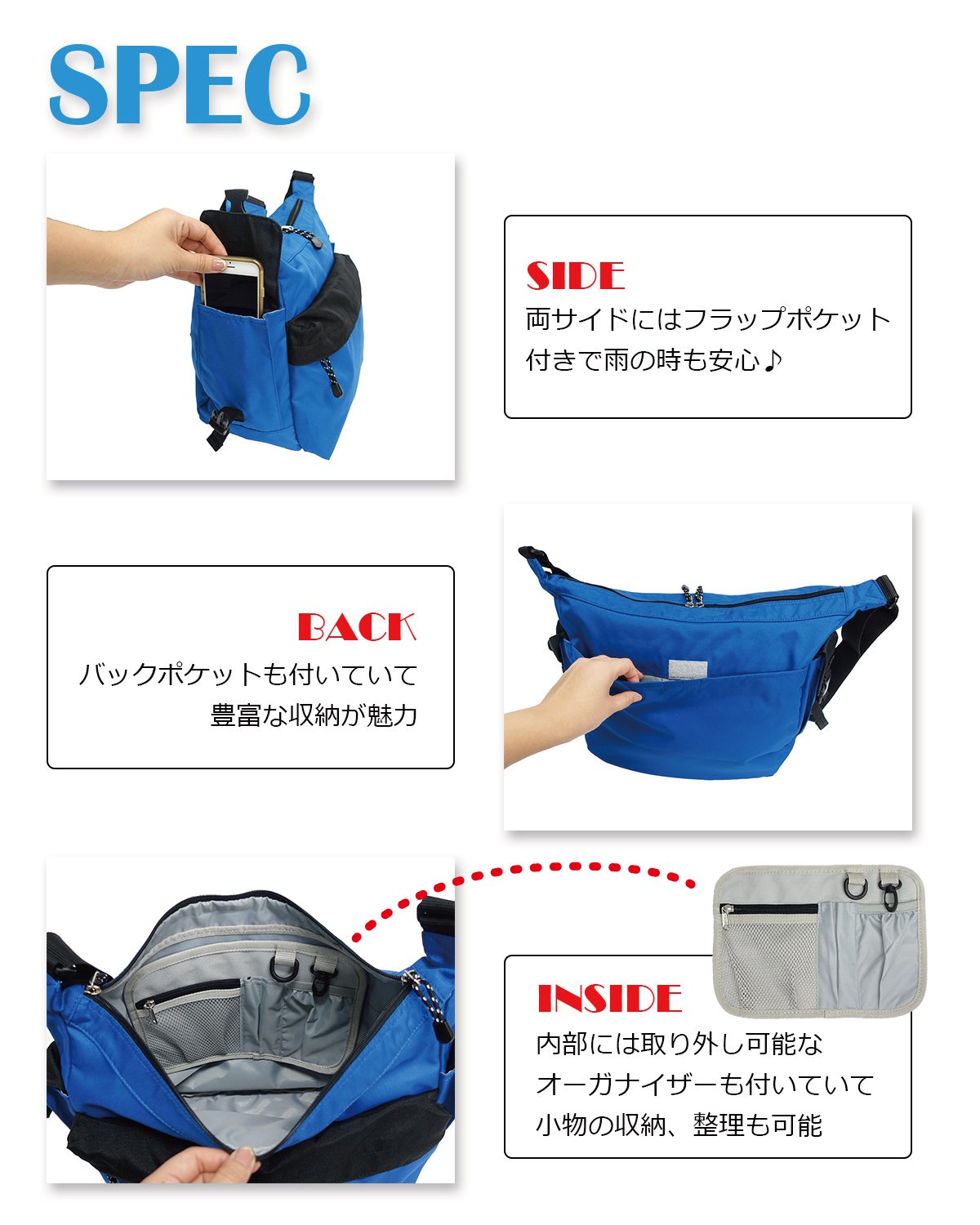 In addition to the conventional front side back pocket, on the inside is equipped with an organizer that can organize small items clearly.