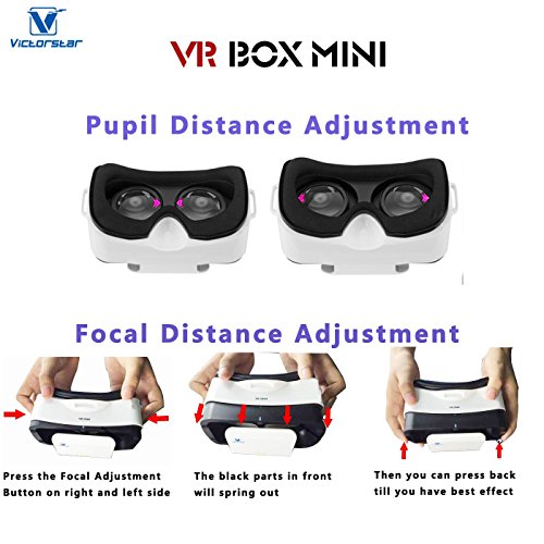 -. Brand : VICTORSTAR -. Feature : VR MINI is the latest design and the most light VR 3D Headset Glasses, it only 6.5 OZ, but it can fits for iPhone, Android phones and Windows phones with screen size within 6.0 inch, recommended phone size is 4.5- 5.5 inch. / Turn your smart phone into the ultimate 3D machine for 3D games and 3D movies(split screen movies); works with over 100+ iOS/Android virtual reality apps in App Store. Search "VR" on Google Play or APP store. A truly fun and immersive experience for any age. / Pupil Distance (PD) and Focal Distance (FD) both can be adjusted to get the best 3D immersive experience. Pupillary Distance adjustment range: 55mm - 75mm. Myopia less than 600 degree is ok to use this item without wearing glasses. / The front cover is not totally enclosed. It makes the phone cool while using, and it is great for ventilation for long use. Very convenient plug headphones, as well as direct to adjust the volume on your smartphone. / The surface of this 3D VR glasses is matte and it also uses a high-definition optical resin lenses. Three adjustable straps can distract part of pressure from the bridge of nose, super face foam protector, comfortable design.Use is safe, but sest no more than 3 hours each time,So that your eyes can have a rest. -. Label : Victorstar -. Manufacturer : Victorstar -. Model : VR Mini -. MPN : VT-VRMINI -. PackageQuantity : 1 -. PartNumber : VT-VRMINI -. ProductGroup : Home -. ProductTypeName : HOME_BED_AND_BATH -. Publisher : Victorstar -. Studio : Victorstar -. Title : VICTORSTAR @ VR BOX MINI with Rechargable Remote Controller, VR MINI 3D Glasses Helmet, Virtual Reality Glasses,Portability 175g with Adjustable Pupil and Focal Distance For 4.5 to 5.5 Inch Smartphones