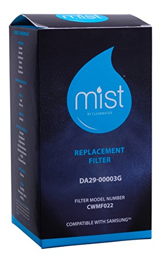 -. Brand : ClearWater Filters -. Feature : High quality, affordable activated carbon filter replacement for / Reduces chlorine, turbidity, cysts, heavy metals and harmful sediments. Eliminates chlorine and pathogens while retaining beneficial minerals and fluoride leaving no odor or taste. / Mist filter line by ClearWater the Higher standard in affordable water filtering. / Long lasting up to six months or 300 gallons -. Label : Clearwater Filters -. Manufacturer : Clearwater Filters -. Model : CWMF022 -. MPN : CWMF022 -. PartNumber : CWMF022 -. ProductGroup : Major Appliances -. ProductTypeName : REFRIGERATION_APPLIANCE -. Publisher : Clearwater Filters -. Studio : Clearwater Filters -. Title : Mist Refrigerator Water Filter Replacement SamsungDA29-00003G
