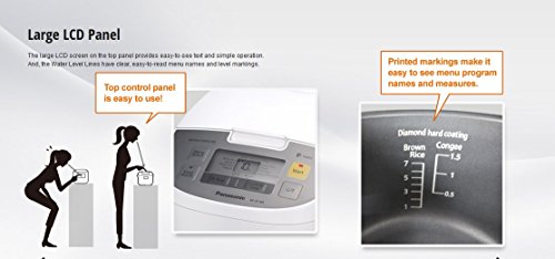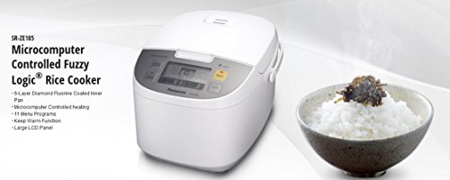 Few things add more to meals than perfectly prepared rice. And the small-footprint Panasonic SR-ZE185 Microcomputer Controlled Rice Cooker makes perfection automatic in any size kitchen. Its 10-cup uncooked rice capacity - 20 cups cooked - is perfect for large families and entertaining. A 24-hour timer makes sure freshly cooked rice is ready when you want it. Panasonic's smart microcomputer control and advanced Fuzzy Logic technology continually sense and regulate heat for different rice types and styles. An advanced six-layer, ultra non-stick inner pan ensures that every grain of rice is evenly cooked and delicious. All you do is put in rice and water, choose from 13 pre-programmed options for the type of rice - or soup, hot cereal or other food - on a large easy to see LCD control panel, and push the button. When done, a convenient keep warm function maintains the ideal serving temperature for up to 12 hours. It doesn't get any easier or tastier than that. Accessories include a rice measuring cup, rice scoop and steamer basket.Feature